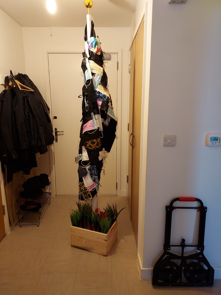 I bought all the materials needed, set everything out on my dining table and played around with how to join each mask together, it looked bulky, messy and silly, then I started to pin each flag together and it began to take form, I pinned a whole patch of masks and new that sewing it was the best option. So that’s what I did for hours! over 100 masks, sewed, listened to the TV, had a break, slept and continued to sew until it was completed.